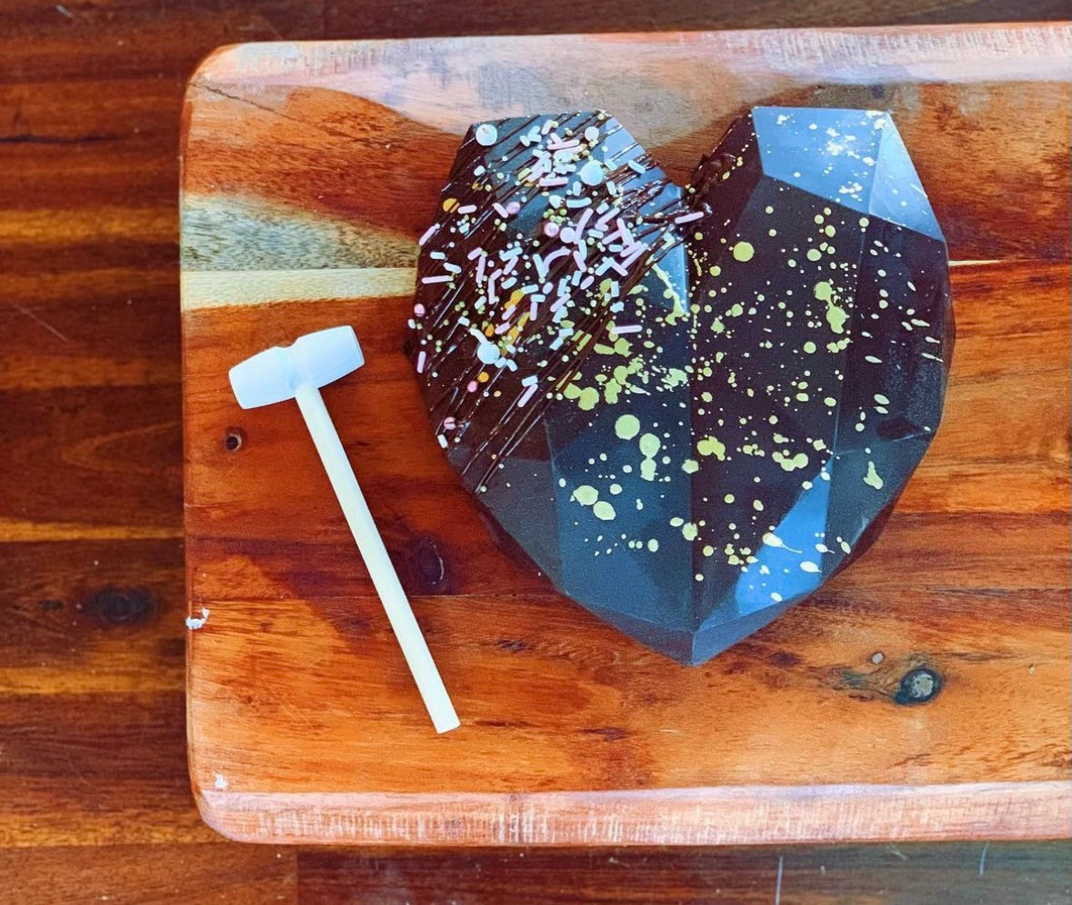 Our favorite dark chocolate tempered into a heart mold with gold decor, filled with our favorite candies such as sour candies, ferro roche, homemade marshmallows, caramels and more! One mallet...